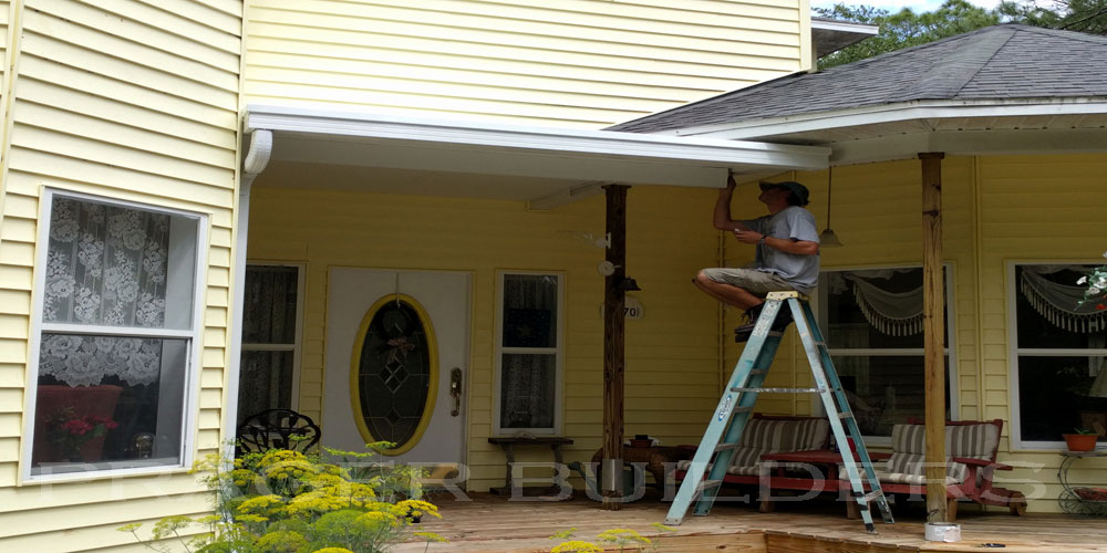 Osteen Patio Cover Our technicians are thorough. This photo shows a patio cover under construction in Osteen on a vintage home in the woods. It shelters the front porch and protects the doors from wind blown rain.