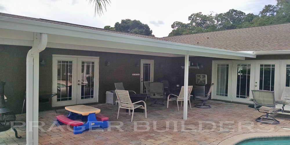 Patio Cover Sanford Florida A pleasant seating area was provided by this rear yard patio cover in Sanford. Note the oversize gutter and downspouts. These homeowners can now relax and enjoy the outdoors like never before.