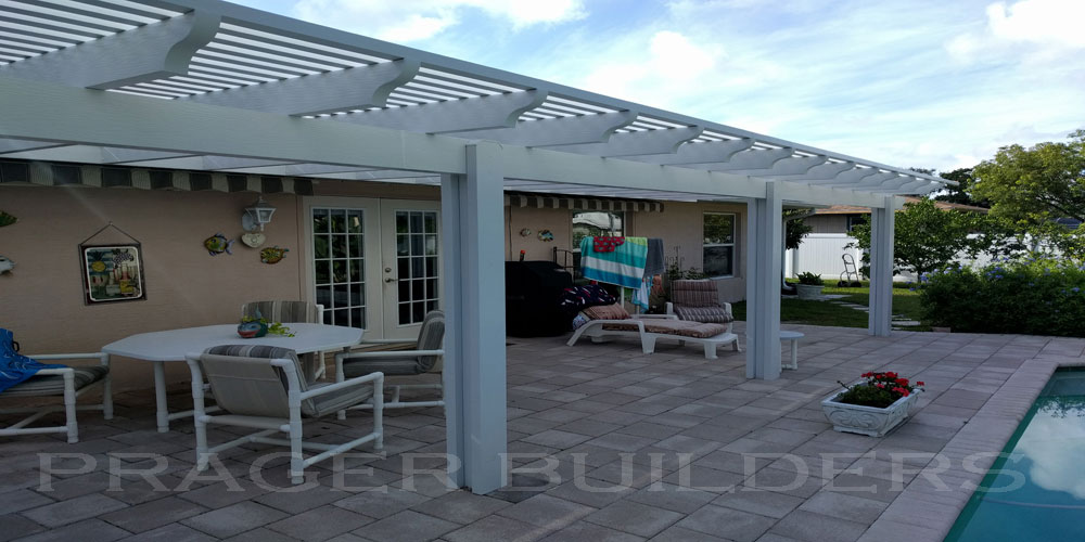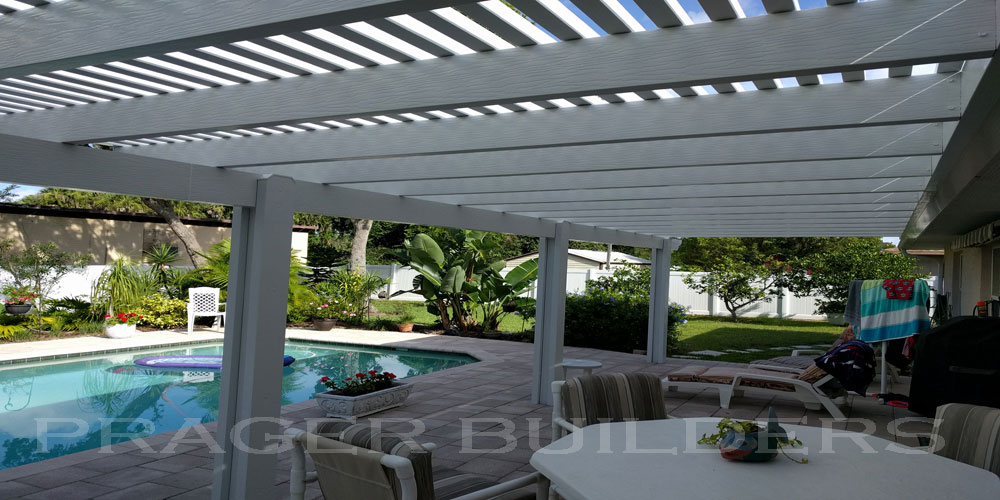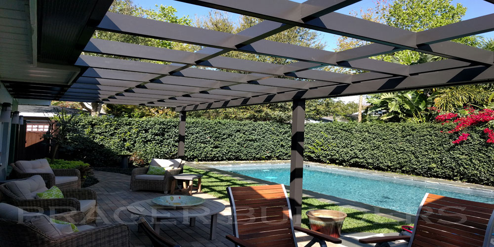 Pergola Patio Cover New Symrna Taking advantage of the view in the large New Smyrna Beach back yard, we constructed and aluminum pergola that provides shade and styling not seen on most homes in the area. Truly beautiful!